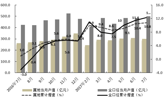 1-7月,我区全口径规模以上工业实现产值3296.0亿元,同比增长12.3%;属地工业完成产值2018.4亿元,同比增长10.8%。