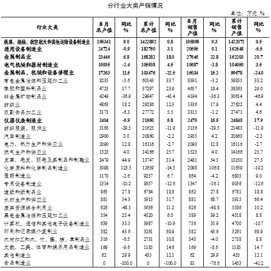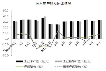 从单月数看,全区工业完成总产值33.5亿元,较7月份增加1.5亿元;同比增长6.7%,增幅较7月份扩大0.4个百分点。完成销售产值33.3亿元,较7月份增加2.0亿元;同比增长8.5%,增幅较7月份扩大3.7个百分点。