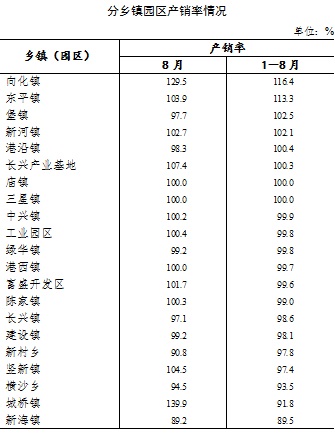 分乡镇园区看,除新海镇相对稍低外,其他全部乡镇园区的单月、累计产销率均高于90%。7月份产销率偏低的城桥镇,8月份下属的骨干企业销售进度明显加快。在其带动之下,城桥镇的累计产销率较之1-7月份时显著上升,一举提高了5.3个百分点。