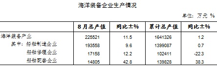 海洋装备产业8月份完成总产值22.6亿元,同比增长11.5%;1-8月份完成总产值164.1亿元,同比增长1.2%。