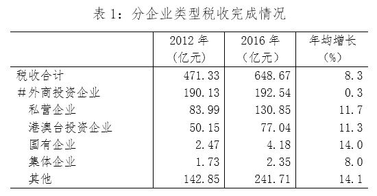 多种所有制经济共同发展,经济运行活力进一步增强。2016年末,全区私营企业注册户数87794户,比2012年增加25340户;2016年私营企业缴纳税金130.85亿元,占全区的五分之一,5年来年均增长11.7%,高于全区税收平均增速3.4个百分点。2016年,港澳台投资企业完成税收77.04亿元,是2012年的1.5倍,年平均增长11.3%。国有企业占税收比重不高,但增长较快,5年来国有企业税收年均增长14.0%。