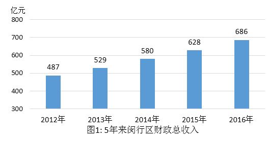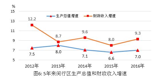 5年来,闵行区财政收入增速始终快于生产总值增速,经济发展质量较高,实现了经济发展与财政增收的良性互动。2012-2016年,全区财政总收入增速分别比生产总值增速快4.7个百分点、0.7个百分点、2.5个百分点、1.4个百分点、和2.3个百分点。