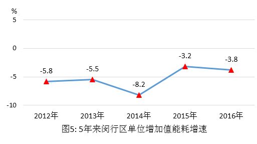 闵行区高度重视绿色发展,主动调结构,淘汰高能耗低效益产能。2016年,全区能源消费总量232.61万吨标准煤,比2012年减少26.66万吨标准煤。2016年,闵行区单位增加值能耗0.2142吨标准煤/万元,2012年以来全区单位增加值能耗实现五连降,2012-2016年分别比上一年下降5.8%、5.5%、8.2%、3.2%和3.8%。5年来,全区工业企业结构调整力度加强,通过关、停等措施不断优化工业结构,逐步淘汰高能耗低效益企业,共涉及关停工业企业约220家,累计节能14.91万吨标准煤。