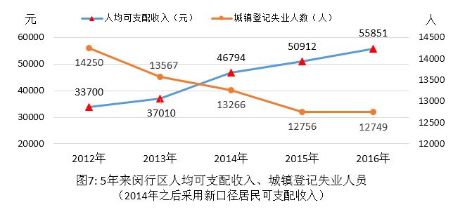 2016年,全区居民人均可支配收入达到55851元,5年来,居民可支配收入年均增长9.7%,比同期生产总值平均增速快2.6个百分点,切实分享到了经济发展的成果。随着收入增加,居民消费意愿逐步增强,2016年人均生活消费支出39063元,比上年增长7.1%。消费结构进一步升级,食品烟酒、衣着、交通通信、生活用品及服务等基本生活消费支出比重逐步下降;教育、文化用品、娱乐服务、家政服务等享受发展型消费支出增长较快,比重逐步上升。通过互联网购买的商品和服务消费支出增长较快, 2016年,闵行区居民人均网购消费支出1417元,比上年增长37.8%。人均网购消费支出占人均消费支出的3.6%,比上年提高0.8个百分点。