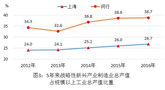 闵行区工业发展经历了由规模扩张向结构优化的转变,伴随着城市功能的提升,全区加快淘汰落后产能,大力推进战略性新兴产业、军民融合产业等先进制造业发展。5年来工业经济总量有所回落,但工业内部结构出现了积极变化。2016年完成战略性新兴产业产值1200.70亿元,占全市的14.5%,占全区规模以上工业总产值的比重达到38.7%,比2012年提高4.4个百分点。2017年上半年,闵行区战略性新兴产业产值占规模以上工业总产值的比重达到38.0%,比全市平均水平高8.3个百分点。战略性新兴产业中新能源汽车和生物医药产业发展较快,5年来年均增速分别达到16.0%和7.0%。