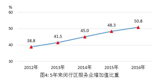 5年来,闵行区服务业发展进入新阶段,2016年服务业占生产总值比重首次超过一半,达到50.8%,比2012年提高12个百分点。5年来服务业增加值年均增长14.6%,比全区经济总体增速高7.5个百分点。服务业已成为全区经济增长的主要推动力,2016年服务业对全区经济增长贡献率达到87%。随着虹桥商务区、莘庄商务区等园区建成运营,未来全区服务业有望迎来新一轮的大发展。
