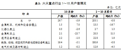 10月份,海洋装备产业实现工业总产值21.9亿元,同比下降5.7%。1~10月份,崇明海洋装备产业累计完成工业总产值207.7亿元,同比下降3.2%。