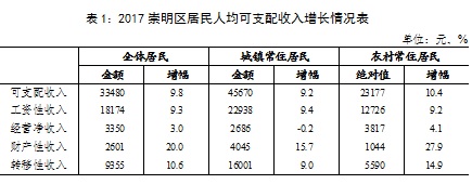 崇明区统计局 2018-02-022017年,我区常住居民人均可支配收入33480元,比去年同期增加2977元,增长9.8%。从总体上看,城乡居民收入增长平稳,居民生活水平不断提高,但后续增收压力以及贫富差距等问题仍值得关注。