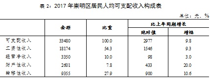 2017年,崇明区居民人均工资性收入为 18174 元,比去年同期增长9.3%,拉动可支配收入增长5.1个百分点(详见表2)。其中,城镇常住居民人均工资性收入为22938元,增长9.4%,拉动城镇居民可支配收入增长 4.7 个百分点;农村常住居民人均工资性收入为 12726元,增长 9.2%,拉动农村居民可支配收入增长 5.1个百分点。城乡居民人均工资性收入增速均比上年分别回落1.6和2.4个百分点,居民工资性收入稳中趋缓。主要原因在于生态岛建设进程不断深化,本区进入经济发展新常态,企业提供的就业岗位以及薪酬增长趋于平稳,我区城镇职工工资、奖金发放总量尚可,增量后劲不足。二是上海市职工最低工资标准逐年提升,但上调幅度有所趋缓。2017 年 4 月 1 日起,上海市职工最低工资标准上调至 2300 元,上调幅度为 5.0% ,上调幅度低于上年3.4个百分点。三是人口老龄化的影响,我区60岁以上老龄人口超过3成,较大的老龄人口比例使得居民收入的结构失衡,影响工资性收入持续增长。