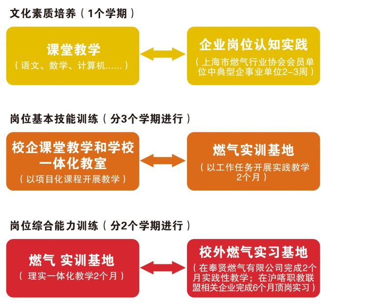 “三阶段、两融合、嵌入递进”工学交替培养模式。燃气专业与上海奉贤燃气有限公司等八家企业深度合作,针对典型岗位需求,以工作岗位为导向,以工作过程为依据,形成以文化基础能力、专业基本技能、岗位综合能力为三个递进阶段,学历证书与职业资格证书评价有机融合,理论与技能相互嵌套的“三阶段、两融合、嵌入递进”工学交替培养模式,把教学活动从课堂延伸到企业常态工作现场和突发抢修现场,使专业理论学习和技能训练与岗位生产紧密对接。