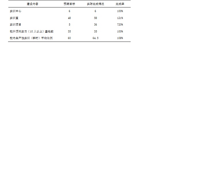 建设内容预期目标实际完成情况完成率实训中心66100%实训室4858121%实训项目536720%校外顶岗实习(10人以上)基地数3535100%校内生产性实训(学时)平均比例6064.5108%(二)发挥了服务区域发展作用1、加强社会化的职业培训。合作并托管的奉贤新世纪培训中心获得上海市5A规范化民非机构,成为区域技能型人才培养的核心基地,很大程度上缓解了区域企业一线人才的短板。