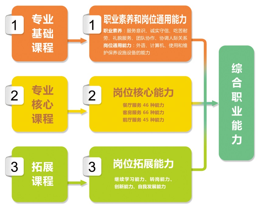 “三三制”职业能力培养模式。酒店专业在专业建设专家指导委员会的引领下,深入酒店行业企业调研,分析酒店典型岗位能力要求,把握酒店人才需求的市场动态变化,从与酒店人才需求对接的角度,厘定餐饮、客房、前厅三个典型岗位的基础能力、核心能力和拓展能力三个层次,分布构建与之相对应三种课程类型,实现课程结构的模块化、课程形式的项目化,培养学生综合职业能力。