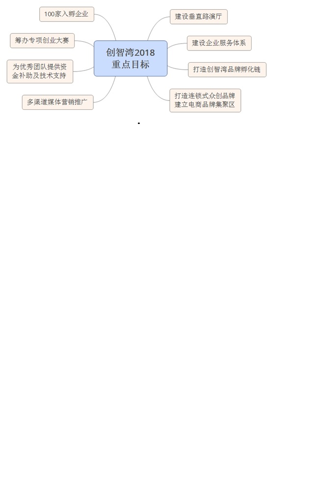 打造电商聚集区,树立创智湾品牌。在2017年基础上,计划在2018年实现100家入孵企业的目标,新增15家毕业企业,达到20家加速器内企业;建立创智湾创业基金,实现天使投资,取得投融资服务;主办特色创业大赛,打造创智湾创业大赛品牌;开设孵化分园;举办多次活动,辐射至江浙沪区域,巩固自身品牌特色,实现创智湾众创空间的品牌化发展。致力于打造以创智湾品牌化为主导的互联网科技孵化产业,利用各方资源,打造辐射华东、华南地区的电子商务行业集聚区(图2)。