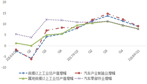 2016年至2018年一季度汽车产业生产增长情况(%)