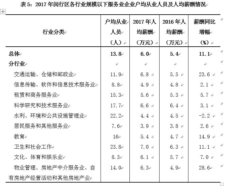 分行业看,除水利、环境和公共设施管理业职工薪酬负增长外,其他行业职工薪酬均有所增加。其中,物业管理、房地产中介服务业、自有房地产经营活动和其他房地产业职工薪酬增速最快,比上年增长28.6%;卫生和社会工作业职工薪酬最高,达到人均7.0万元,居民服务和其他服务业职工薪酬最低,人均3.9万元(见表5)。