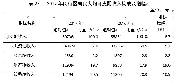 2017年,根据闵行区住户收支与生活状况调查数据显示,闵行区居民人均可支配收入60736元,较上年增长4885元,同比增幅为8.7%,具体收入构成及构成如下(见表2):