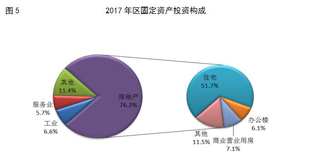 全年实现固定资产投资总额379.03亿元,同比增长11.0%。其中第二产业实现固定资产投资总额25.13亿元,同比增长36.8%,第三产业实现固定资产投资总额353.90亿元,同比增长9.5%。固定资产投资构成中,工业投资比重为6.6%,服务业比重为5.7%,房地产投资比重最大,为76.2%,其中商业营业房投资和办公楼投资占总投资的比重分别为7.1%和6.1%。