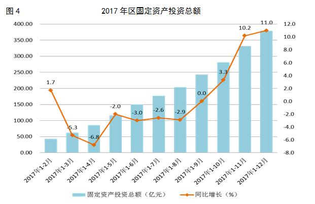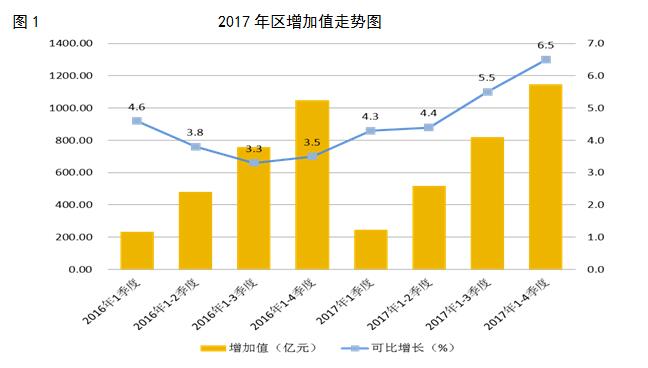 据测算,2017年全区实现增加值1147.36亿元,可比增长6.5%。其中:第一产业实现增加值1.18亿元,下降13.1%;第二产业实现增加值358.87亿元,增长8.0%;第三产业实现增加值787.30亿元,增长5.8%。三次产业结构比为0.1:31.3:68.6,第二产业所占比重比上年提高0.5个百分点,实体经济在2017年得到稳步复苏。