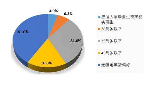 3、企业对招聘员工的年龄区间偏好依次为:无特定年龄偏好(41.0%),35周岁以下(31.0%),45周岁以下(16.8%),28周岁以下(6.3%),应届大学毕业生或在校实习生(4.9%)(见图2)。