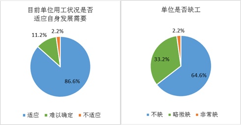 1、目前单位用工总体状况是否适应单位自身发展的需要:有86.6%的企业认为适应,2.2%的企业认为不适应,另有11.2%认为难以确定。目前单位是否缺工:有64.6%的企业认为不缺工,35.4%的企业认为存在缺工情况,其中非常缺占比为2.2%、略微缺占比为33.2%(见图3)。