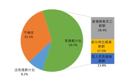 被调查单位中,有59.7%的企业今年有调薪计划,其中计划普遍提高员工薪酬的企业占比为28.4%,计划部分岗位提高薪酬的企业占比为17.5%,计划因人而异提高薪酬的企业占比为13.8%。而没有提薪计划的企业占8.2%,另有32.1%的企业尚不确定是否提薪(图5)。