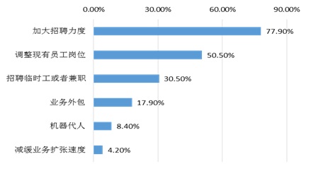 3、缺工单位解决缺工问题的方法依次为:加大招聘力度(77.9%),调整现有员工岗位(50.5%),招聘临时工或者兼职(30.5%),业务外包(17.9%),机器代人(8.4%),减缓业务扩张速度(4.2%)(见图4)。