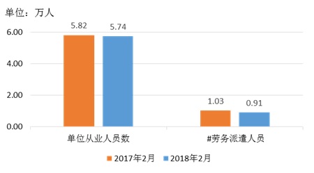 一季度,我区300家企业用工抽样调查单位共有从业人员5.74万人,比去年同期减少823人,同比减少1.4%。其中,劳务派遣人员0.91万人,占总数的15.8%,比去年同期减少1220人,同比减少11.9%(见图1)。劳务派遣人员减少较多,其原因为受《劳务派遣暂行规定》影响,从2016年3月1日起,用工单位使用的被派遣劳动者数量不得超过其用工总量的 10%,至今仍有部分使用劳务派遣人员的企业陆续改为使用其他用工方式。