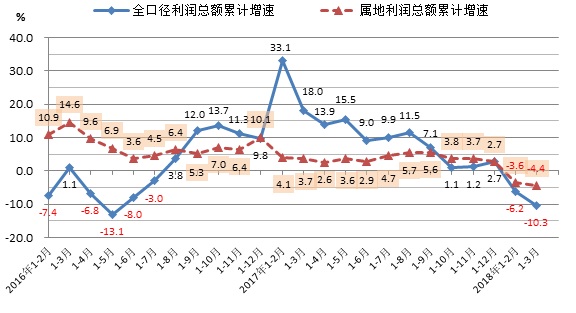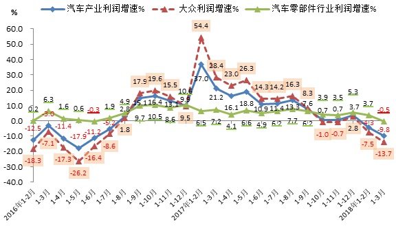 2016-2018年一季度汽车产业及汽车零部件业利润增长趋势