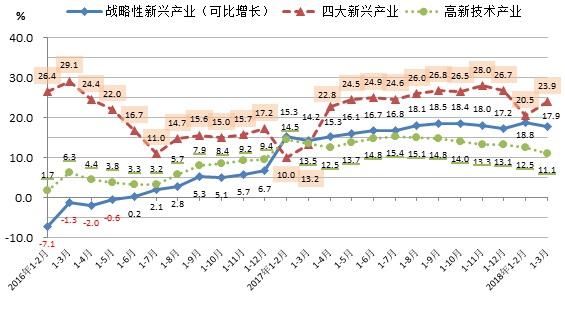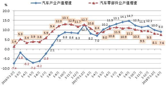 2016-2018年一季度汽车产业及汽车零部件业产值增长趋势