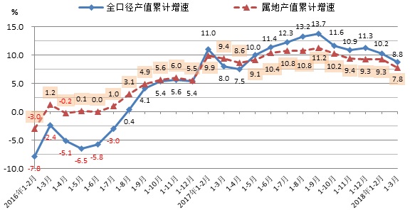 嘉定区统计局 2018-05-031-3月,面对错综复杂的内外环境,我区工业运行平稳开局,总体延续2017年三季度以来稳中趋缓的态势,增长基本符合预期,顺利实现开门红。