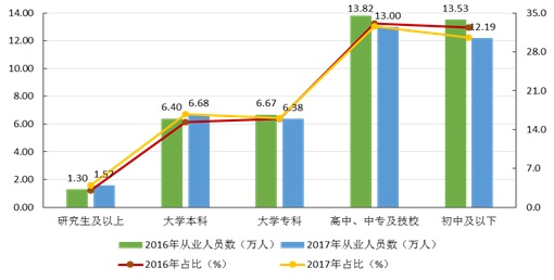 按学历分:2017年本区“四上”企业从业人员中大学专科(不包含高职)及以上学历人员为14.63万人,占“四上”单位从业人员的36.7%,较上年同期上升了2.4个百分点。其中,研究生及以上学历从业人员为1.57万人,比上年同期增加0.27万人,占总人数的3.9%,较上年同期上升0.9个百分点;大学本科从业人员为6.68万人,比上年同期增加0.24万人,占总人数的16.8%,较上年同期上升1.5个百分点;大学专科(不包含高职)从业人员为6.38万人,比上年同期减少0.29万人,占总人数的16.0%,占比与上年同期相比持平(见图3)。