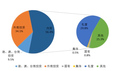 从企业数量和从业人员数两方面看,内资企业占比超本区一半以上,但其100人以下(不包含100人)的企业较多,共998个,占比为46.9%;100-199人的企业282个,占比为13.2%;200人及以上的企业258个,占比为12.1%。外资企业中100人以下(不包含100人)企业159个,占比为7.5%;100-199人的企业107个,占比为5.0%;200人及以上外资企业150个,占比为7.1%(见表3)。
