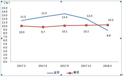 图二 2017.3-2018.3全市及奉贤社会消费品零售总额累计增速