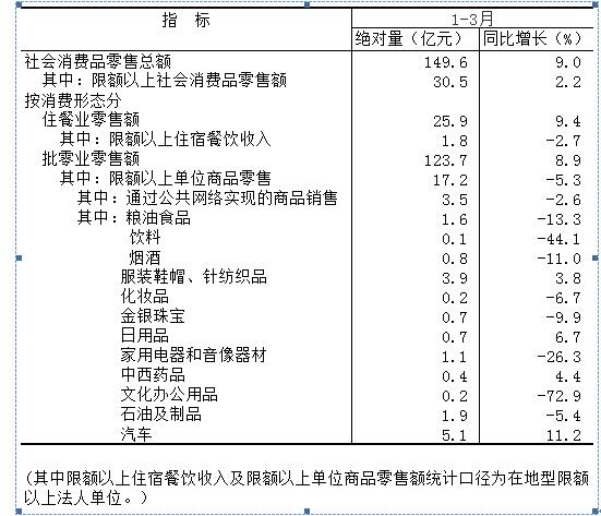 一季度,限额以上单位零售额主要呈现连锁餐饮、汽车类及服装鞋帽针纺织品类三类商品增长,网络零售、石油及制品类消费下降的特点。