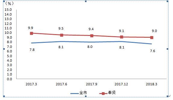 图一 2017.3-2018.3全市及奉贤商品销售总额累计增速