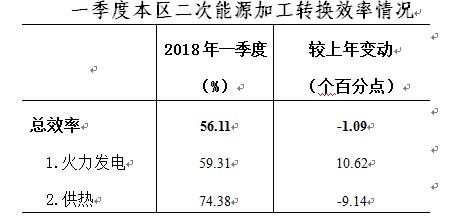 一季度,奉贤区加工转换总投入7.94万吨标煤,总产出4.46万吨标煤,总效率56.11%,同比下降1.09个百分点。从产出类型看,火力发电效率59.31%,同比上涨10.62%;由于申能星火热电本年3月开始处于关闭整合阶段,供热效率同比下降9.14%。