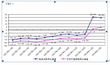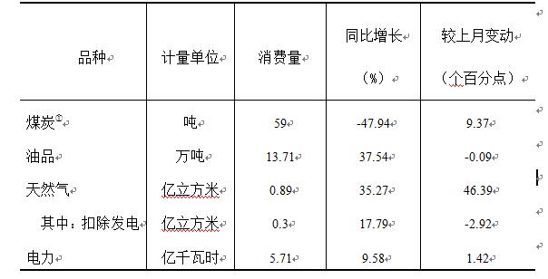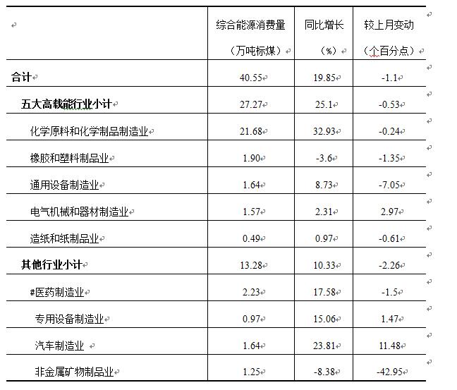 除高载能行业以外的其他行业综合能源消费量13.28万吨标煤,比去年同期上涨10.33%,涨幅较上月收窄2.26个百分点。其中,传统非金属矿物制品受需求量下降的影响,综合能源消费量同比下降8.38%,较上月由增转降,降幅扩大42.95个百分点,其余几个大类能源消费总量下降有限;反之,我区的新动能产业,如医药制造业、汽车制造业、专用设备制造业等行业均呈现能耗上涨,且上涨幅度明显,分别为17.58%、23.81%和15.06%。