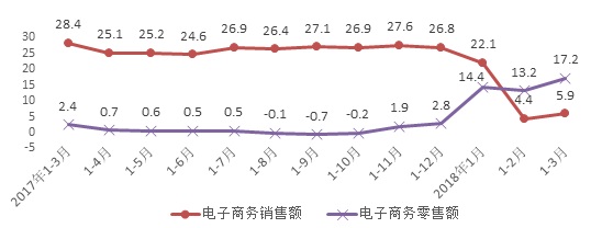 图3 2017年3月至2018年3月电子商务销售、零售额增长情况