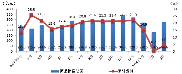 图1 2017年、2018年一季度各月属地商品销售总额及累计增幅