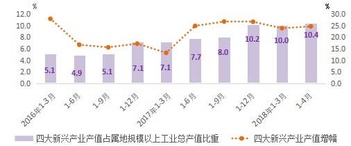 四大新兴产业持续壮大。1-4月,全区四大新兴产业均实现两位数增长,共实现产值126.2亿元,同比增长24.7%,增幅高出全区属地规模以上工业总产值15.3个百分点,占全区属地规上工业总产值的10.4%,比重较去年同期提高2.9个百分点。