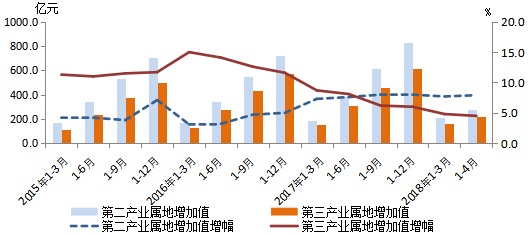 1-4月,全区实现增加值749.3亿元,可比增长7.3%。其中,属地实现增加值494.0亿元,可比增长6.4%。从属地经济的产业结构来看,第二产业实现增加值277.8亿元,可比增长7.9%,第三产业实现增加值215.7亿元,可比增长4.5%,第二产业增速快于第三产业3.4个百分点。三次产业比为0.1:56.2:43.7。