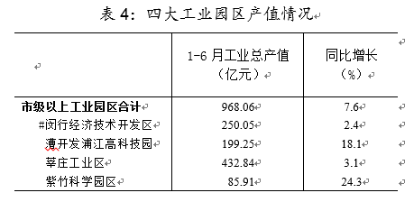 上半年,四大工业园区共实现工业总产值968.06亿元,同比增长7.6%,增幅高于全区工业增幅4.5个百分点。其中紫竹科学园区实现工业产值85.91亿元,同比增长24.3%,增幅居首位。园区里7家工业企业有4家产值同比增长。漕开发浦江高科技园实现工业产值199.25亿元,同比增长18.1%,增幅居第二,园区内38家企业有35家产值同比增长。闵行经济技术开发区实现工业总产值250.05亿元,同比增长2.4%。园区内55家工业企业有36户企业产值同比增长, 19家企业产值同比下降,但产值增长的企业大部分增速平稳,对园区整体增长拉动不明显。莘庄工业区实现工业总产值432.84亿元,同比增长3.1%,园区内171户企业有106户企业产值增长,同比增14.2%,65户企业产值同比下降,降幅为17.3%。二者共同作用,园区总体产值增速不快。