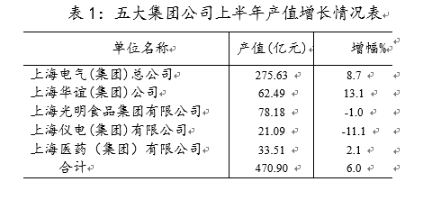 上半年,五大集团公司共实现产值470.90亿元,同比增长6.0%,增幅比1-5月收窄2.1个百分点。其中上海电气(集团)总公司实现产值275.63亿元,同比增长8.7%,上海华谊(集团)公司实现产值62.49亿元,同比增长13.1%;上海医药(集团)有限公司实现产值33.51亿元,同比增长2.1%;上海光明食品集团有限公司和上海仪电(集团)有限公司产值同比分别下降1.0和11.1%。