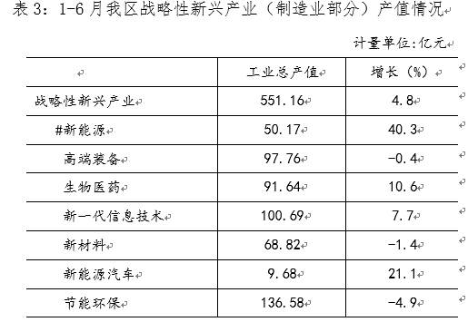 上半年,战略性新兴产业实现工业总产值551.16亿元,同比增长4.8%。战略性新兴产业是各级政府大力扶持的产业,经过前几年的快速发展后,增速有所放缓,但增速仍高于全区工业增幅1.7个百分点。分类来看,七大战新产业中四升三降,其中:新能源产业上半年实现工业总产值50.17亿元,同比增长40.3%;新能源汽车共7户企业,上半年实现工业总产值9.68亿元,同比增长21.1%;生物医药58家企业,上半年实现工业总产值91.64亿元,同比增长10.6%,其中有37家工业总产值增长,增长企业产值增幅为16.8%;新一代信息技术上半年实现工业总产值100.69亿元,同比增长7.7%,产业内38户企业有19户产值同比增长,增长企业实现产值57.51亿元,增幅为26.9%。其他三个产业新材料、节能环保和高端装备制造同比不同程度下降。(见表3)