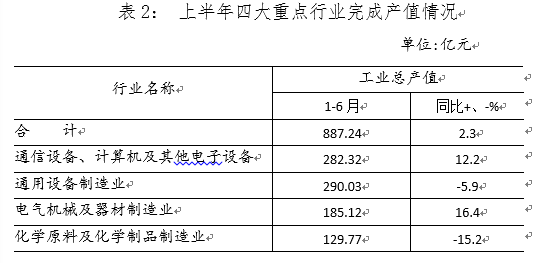 上半年,我区4个重点行业产值二增二降,其中:通信设备、计算机及其他电子设备制造业增长12.2%;电气机械及器材制造业,增长16.4%;通用设备制造下降5.9%;化学原料及化学制品制造业下降15.2%,该行业63户企业有21户产值下降,这21户企业上半年实现产值28.54亿元,同比下降18.9%。