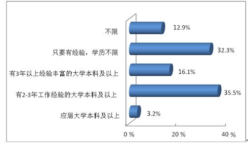 企业如果有招聘意向,更偏好有工作经验的大学生。调查数据显示,企业对所招聘员工具备工作经验及大学本科以上学历的占比为51.6%,分别是有2-3年工作经验的大学本科及以上占比35.5%、有3年以上经验丰富的大学本科及以上占比16.1,而应届大学本科及以上的占比为3.2%、只要有经验学历不限的占比为32.3%、不限要求的占比为12.9%,所以对于应聘者而言,同时具备丰富的工作经验和大学本科及以上学历,在职场上像香饽饽般深受招聘企业喜欢(见图2)。