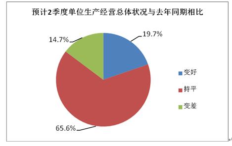 调查数据显示:单位生产经营总体状况整体平稳。预计我区2季度单位生产经营总体状况与去年同期相比,65.6%的企业认为与去年同期变化不大,19.7%的企业认为好于去年同期,仅有14.7%的企业认为较去年同期有所变差(见图1)。