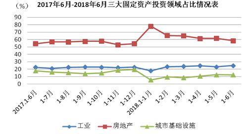 从2017年6月至2018年6月三大固定资产投资领域的增幅情况看(见图1),增幅情况有所波动。工业投资、城市基础设施投资受大项目影响增幅波动较为明显。