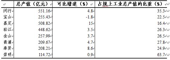 从主要指标完成情况看:三次产业增加值稳健增长,可比增长7.3%(同比增长9.8%),为六年同期最高增幅;工业生产领域增长强劲,规模以上工业产值继续保持两位数增长,增幅达14.0%,增速郊区排名第二;财政收入持续高速增长,同比增长36.2%,区级地方财政收入同比增长32.6%,全市排名第二;消费市场保持稳定,实现社会消费品零售总额288.0亿元,同比增长8.8%;固定资产投资保持较快增长,完成投资总额190.2亿元,同比增长12.3%,其中工业投资同比增长19.8%,较上年同期提高了22.2个百分点;实现全区居民人均可支配收入22681元,同比增长9.1%。