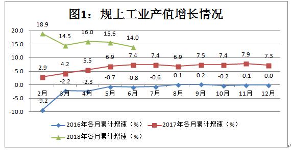 上半年我区工业生产强劲增长,1-6月份,全区940家规模以上工业企业累计完成产值835.8亿元,同比增长14.0%,比一季度放缓0.5个百分点,增幅较去年同期提高了6.6个百分点(见图1)。